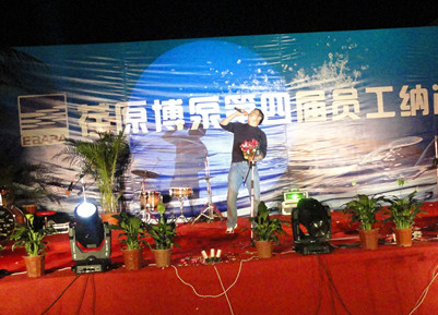 18:30分,晚會節目正式開始,首先在晨曦樂隊激情飛揚的搖滾歌曲聲中拉開了晚會的序幕。晚會節目有獨唱、小合唱、舞蹈等等,演員們的精彩表演,博得了員工們陣陣掌聲和喝彩。特別是生產部門女職工排練的舞蹈,動感十足,展示了女員工的多姿多彩的精神風貌。常務副總經理王正軍的一曲豪邁的《紅旗飄飄》,抒發了荏原博泵員工的愛國情懷;北京事務所的王信東部長帶來了抒情歌曲《別問》;王虹權、袁磊、趙喜鵬、周新菊、肖旭、竇群、蔣祺、張雷雷、徐道義、董旭光等員工先后表演了自己準備的節目;職工子女表演的拉丁舞更是把晚會的氣氛推向高潮。